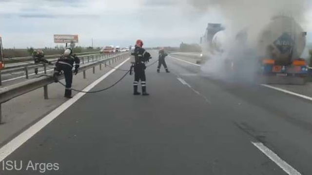 Circulatie restrictionata pe A1. O autocisterna care transporta carburant a luat foc