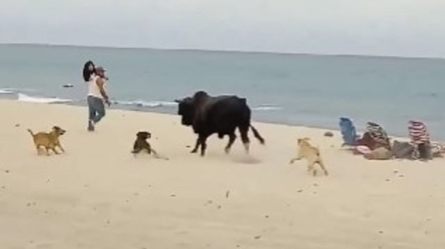 Panică pe o plajă populară. Turiștii, fugăriți și atacați de un taur VIDEO