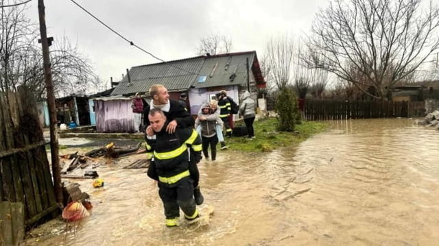 Tineri din Hunedoara, cărați în spate de pompieri ca ”să nu-și ude papucii” în inundații
