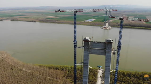 Podul suspendat de la Braila se apropie de etapa spectaculoasa a constructiei. "Se vor intinde pe 2 kilometri in linie dreapta"