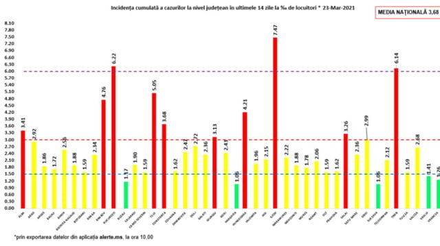 Incidenta cazurilor de COVID-19 raportate pe 23 martie. Record in Ilfov, cu o rata de infectare de 7.47 la mia de locuitori