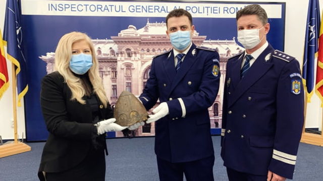 FOTO/ VIDEO Un coif viking, unicat in Romania si rar in Europa, recuperat de politie. "Colectionarul" era un barbat care facuse lucrari de amenajare pe raul Siret
