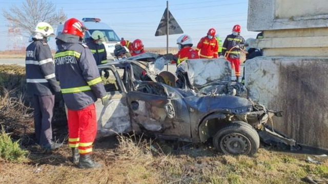 VIDEO Accident cumplit in Olt. Soferul a murit carbonizat dupa ce a intrat cu masina in monumentul de la intrarea in Slatina