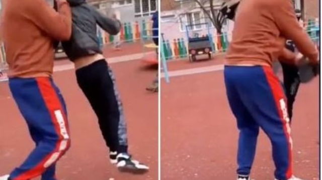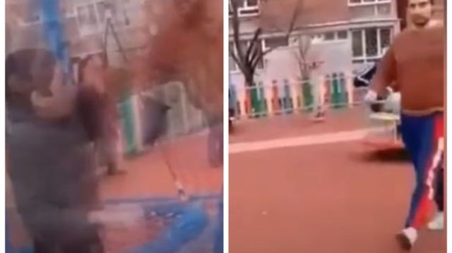 VIDEO Agresiune extrema in parcul de joaca. Un barbat strange doi copii de gat si ii loveste cu putere de caldaram