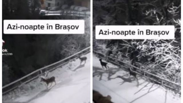VIDEO Imagini splendide cu cerbi surprinsi, noaptea, in fata unor pensiuni din Brasov, dupa ce au coborat din padure