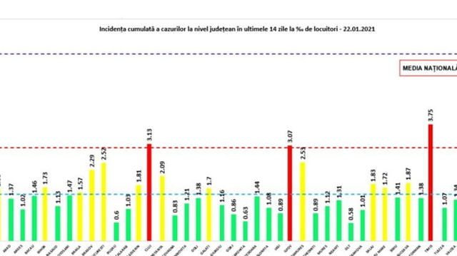 GRAFIC privind incidenta cazurilor de coronavirus. Capitala, a treia zi consecutiv sub 3 la mie. Trei judete au ramas in scenariul rosu