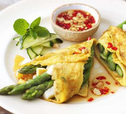 Clatite inedite cu sparanghel, cocos si sos dulce de chilli