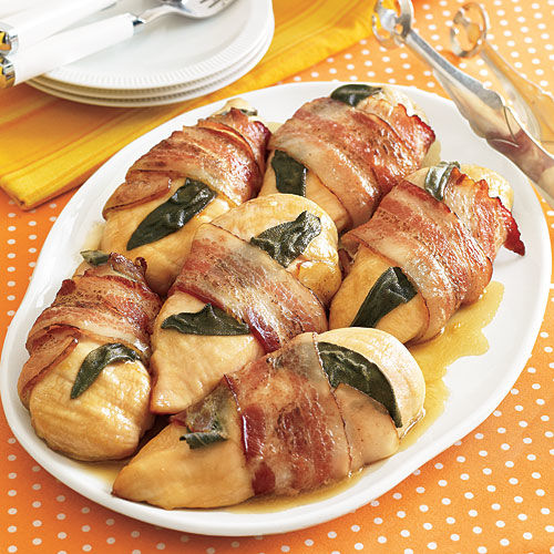 Piepturi de pui infasurate in bacon si salvie