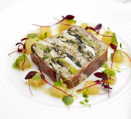 Terina de carne de pui cu praz invelita in prosciutto