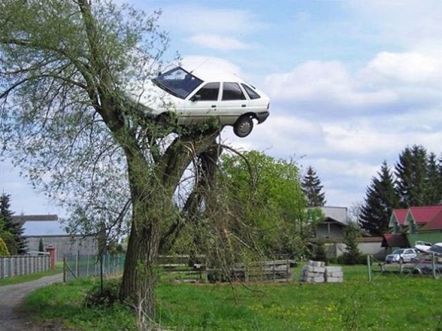 Întâmplare incredibila în Polonia! Nu ai nicio șansă să ghicești cum a ajuns aceasta mașina în copac!