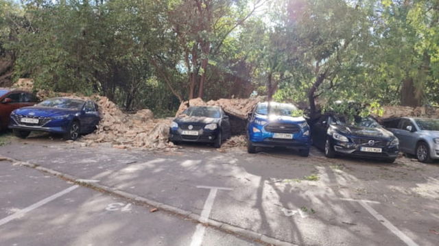 Opt mașini parcate, distruse de un zid care s-a prăbușit peste ele. Ce s-a întâmplat