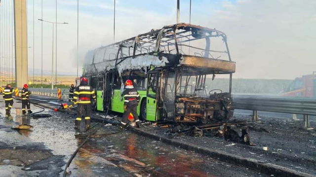 Autocar distrus de flăcări pe podul de la Brăila. Șoferul și cei 35 de pasageri erau ucraineni