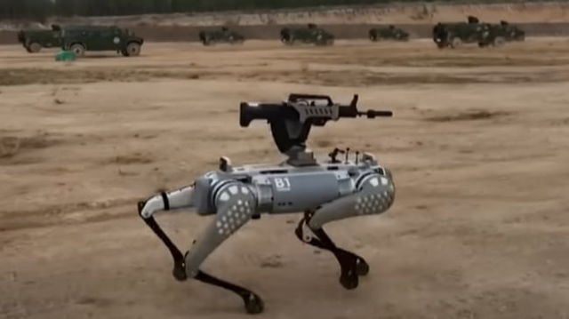 Câinele robot cu pușcă automată inventat în China. Poate „efectua recunoașteri, identifică inamicul și lovește ținta” VIDEO