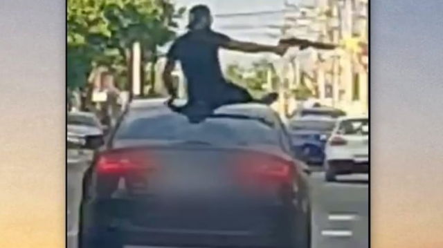 Momentul în care doi bărbați se urcă pe plafonul unei mașini și încep să amenințe cu o armă trecătorii. Totul a fost filmat VIDEO